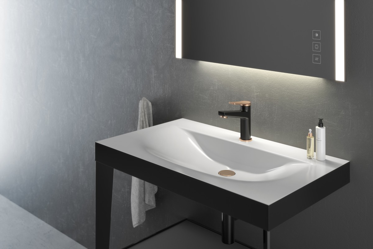 We sometimes call fittings the "jewellery" of the bathroom. The SEPPIA ROSE GOLD standing washbasin mixer fully deserves this name. A decoration of a Black matt washbasin - rose gold charms with its slender, organic form of the body and spout of impeccable proportions. This model of unique aesthetics can be used together with other elements of the collection in a designer bathroom decorated in a glamour style It comes complete with a black click-clack plug.