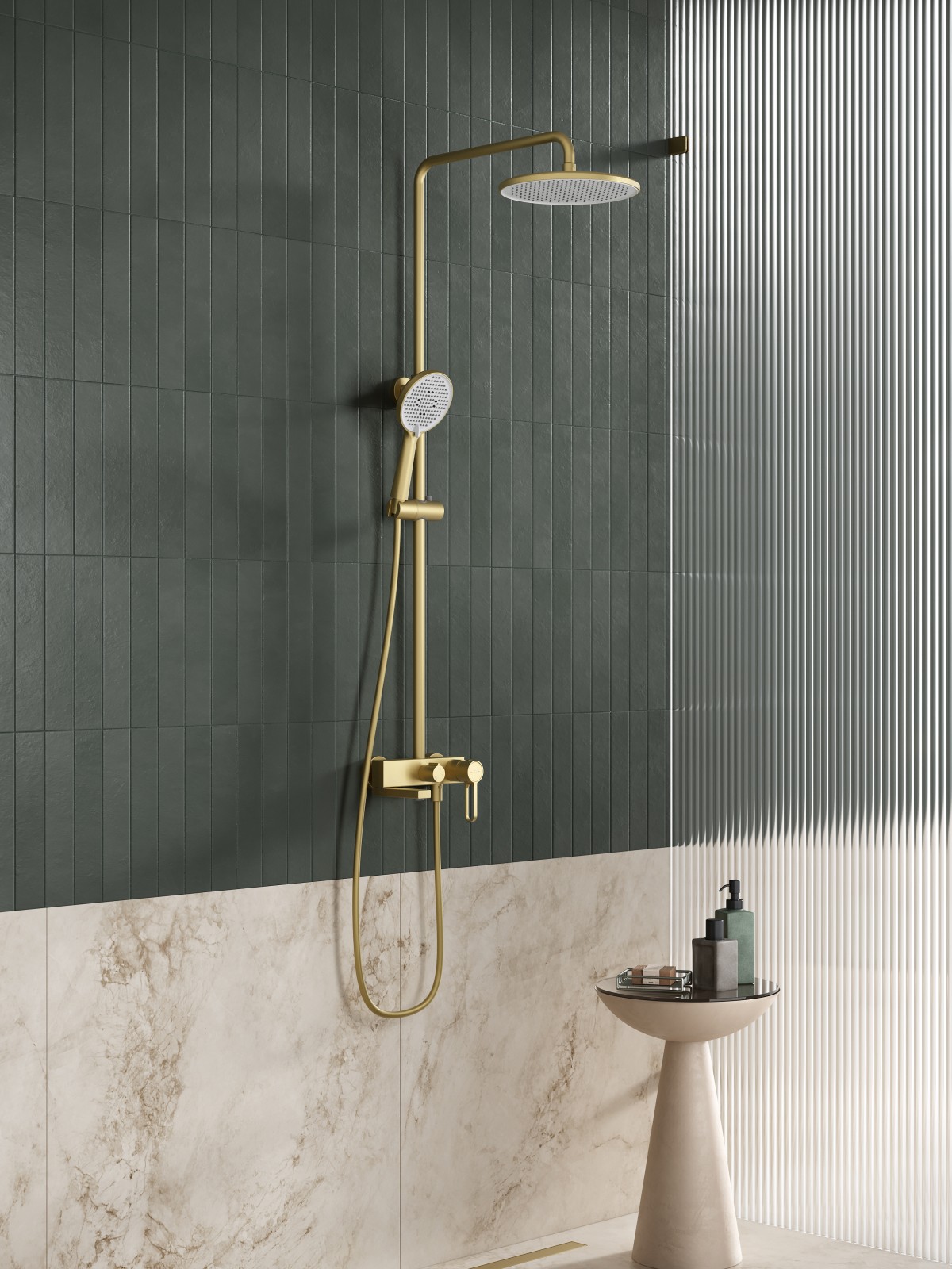 The brushed gold shower column blends beautifully with both light and dark bathroom arrangements, highlighting their elegant, modern style. It is an ideal choice for those looking for a designer shower column with a bath mixer that combines refined aesthetics with practical functionality.